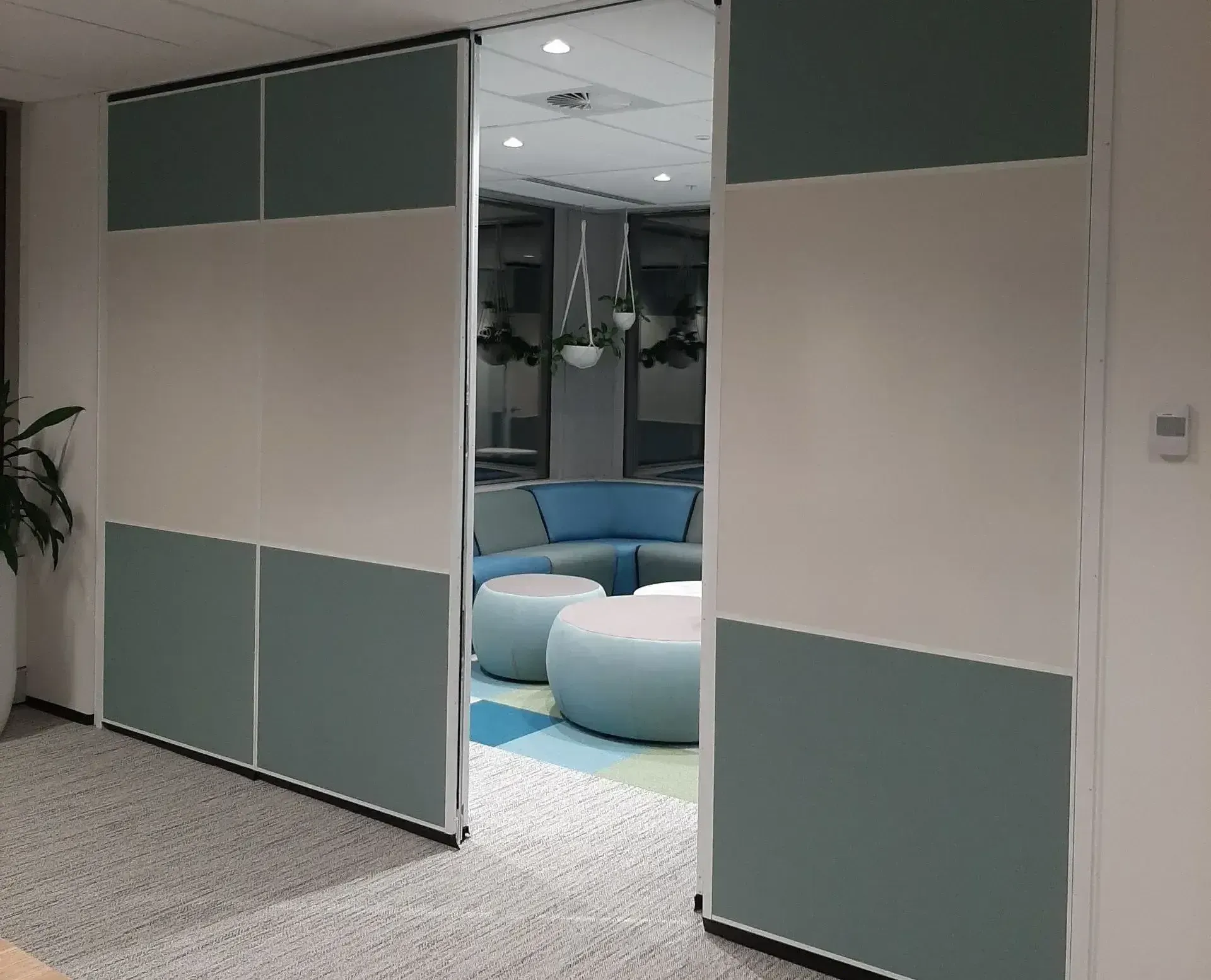 In this recently completed project at Phillips’ Head Office, Bildspec Operable Walls have used Woven Image Meridian material, in conjunction with Vitreous Enamel Magnetic Whiteboards to provide a second functional use for this room divider. The bottom panel is made from a hard wearing Laminex Laminate. What this achieves is a moving wall system with various secondary functions.