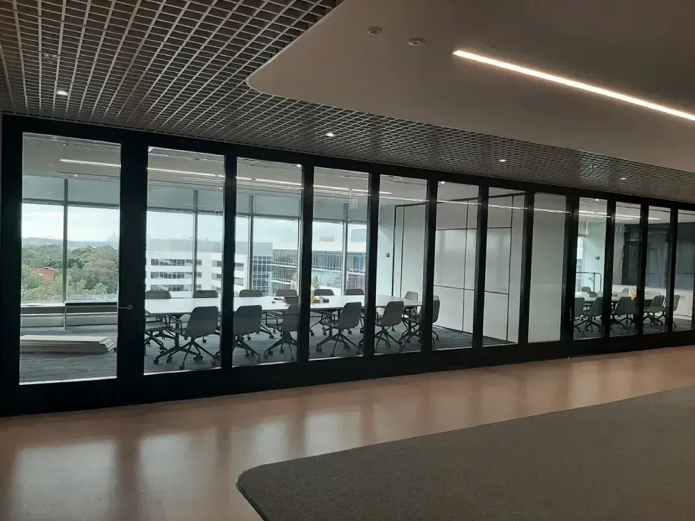 Bildspec recently installed two operable walls at UAC’s ultra-sleek Head Office at River Boulevarde, Rhodes. The installation consists of a Series 100 Konnect Double Glazed remote stacking operable wall (Rw48) with inset pass doors and 3-way multi meeting post, which runs perpendicular to another Series 100R (solid) operable wall (Rw52) separating two meeting rooms.